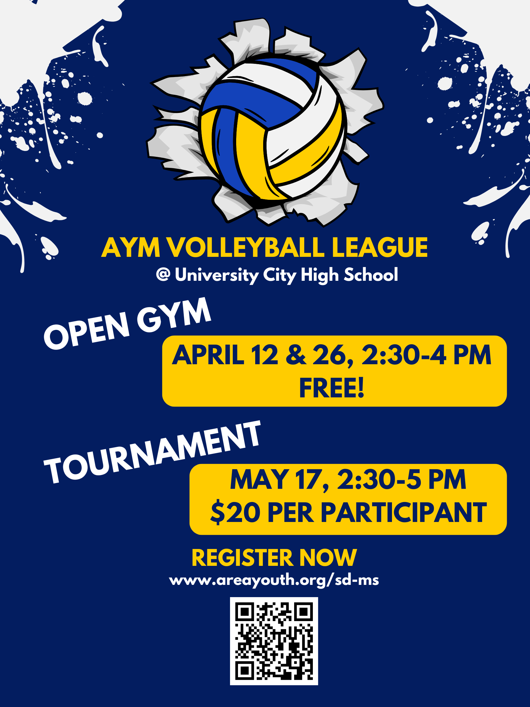 AYM will also be hosting volleyball open gyms on Sunday, April 12th and Sunday, April 26th. If you do not have a team ready to compete in the tournament, come to the open gym to meet other middle schoolers interested in competing in the tournament and form your new team!